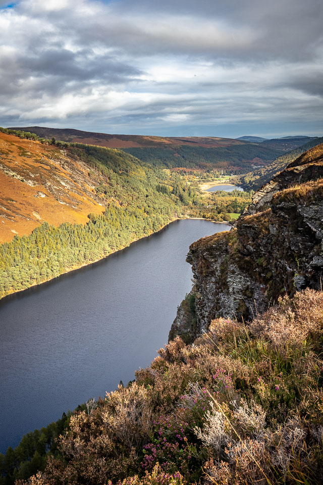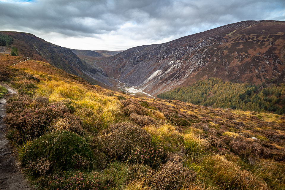 The trail we took (The Spinc trail, the white dots on this map ) climbs up and around the upper lake. The trail first goes though the ruins of Reefert church then climbs steeply up by the Poulanass Waterfall before joining a boardwalk. More than 600 wooden steps lead you to a viewing point overlooking the Upper Lake. A 3 mike long boardwalk skirts the top of the cliffs before descending through blanket bog and heath into the picturesque Glenealo Valley, home to a large herd of deer. A rough track then leads you back down into Glendalough Valley.