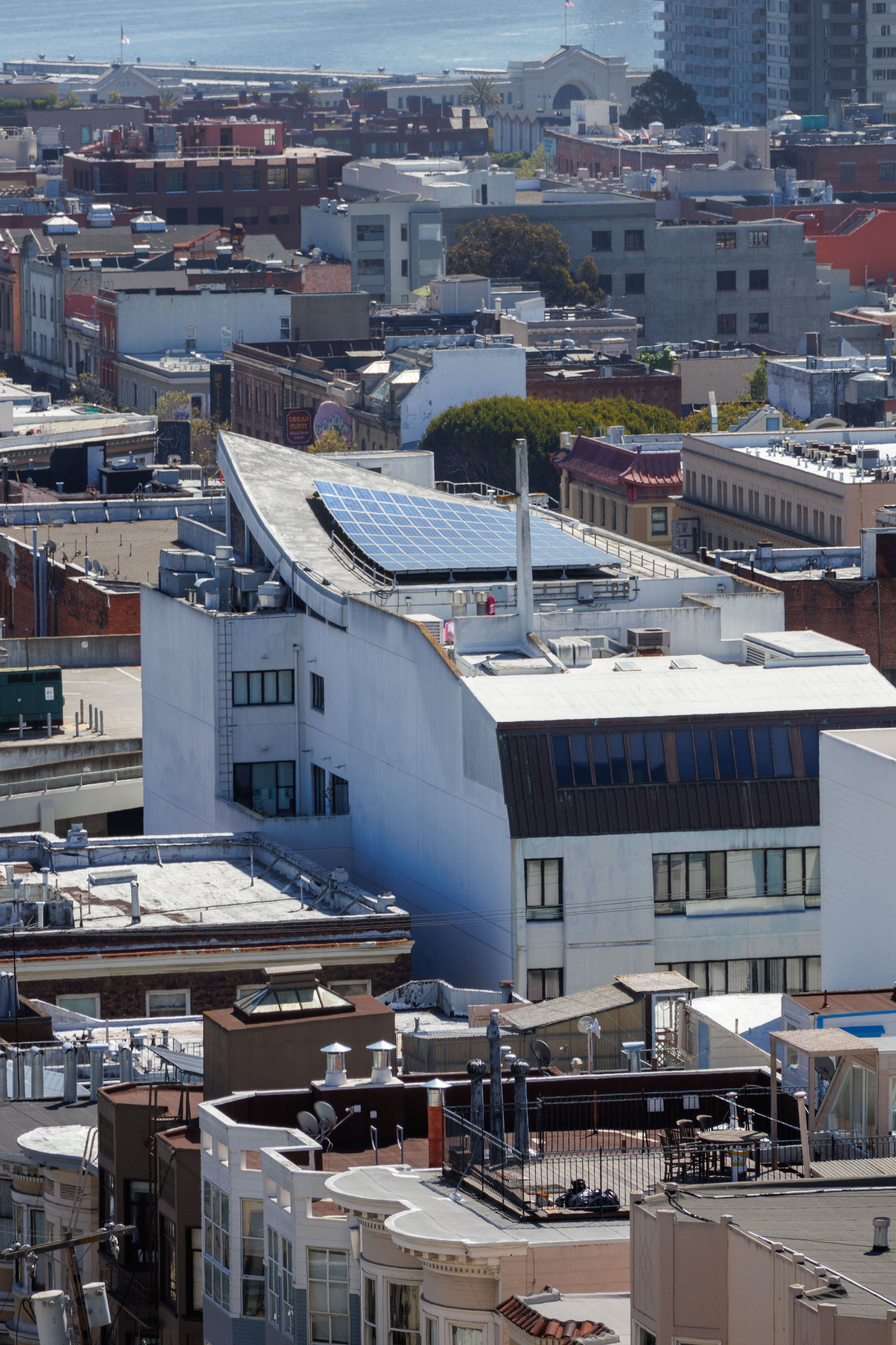 Russian Hill is directly to the north from Nob Hill, to the south from Fisherman's Wharf, and to the west of the North Beach neighborhood. At the northern foot of the hill is Ghirardelli Square, which sits on the waterfront of the San Francisco Bay, Aquatic Park, and Fisherman's Wharf. A trip down the winding turns of Lombard Street and across Columbus Avenue to the east leads to the neighborhood of North Beach. Down the hill to the west, past Van Ness Avenue, are Cow Hollow and the Marina districts.