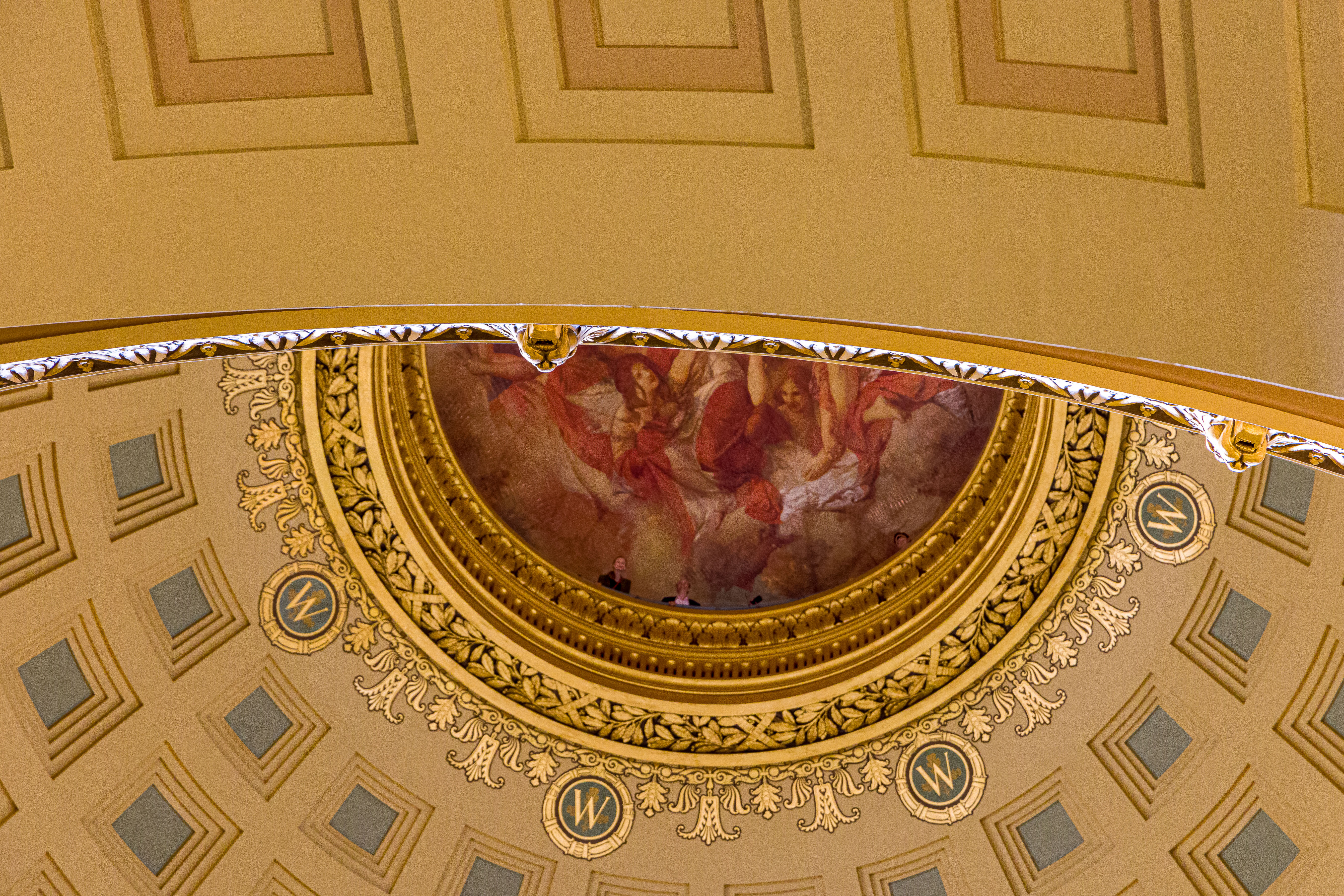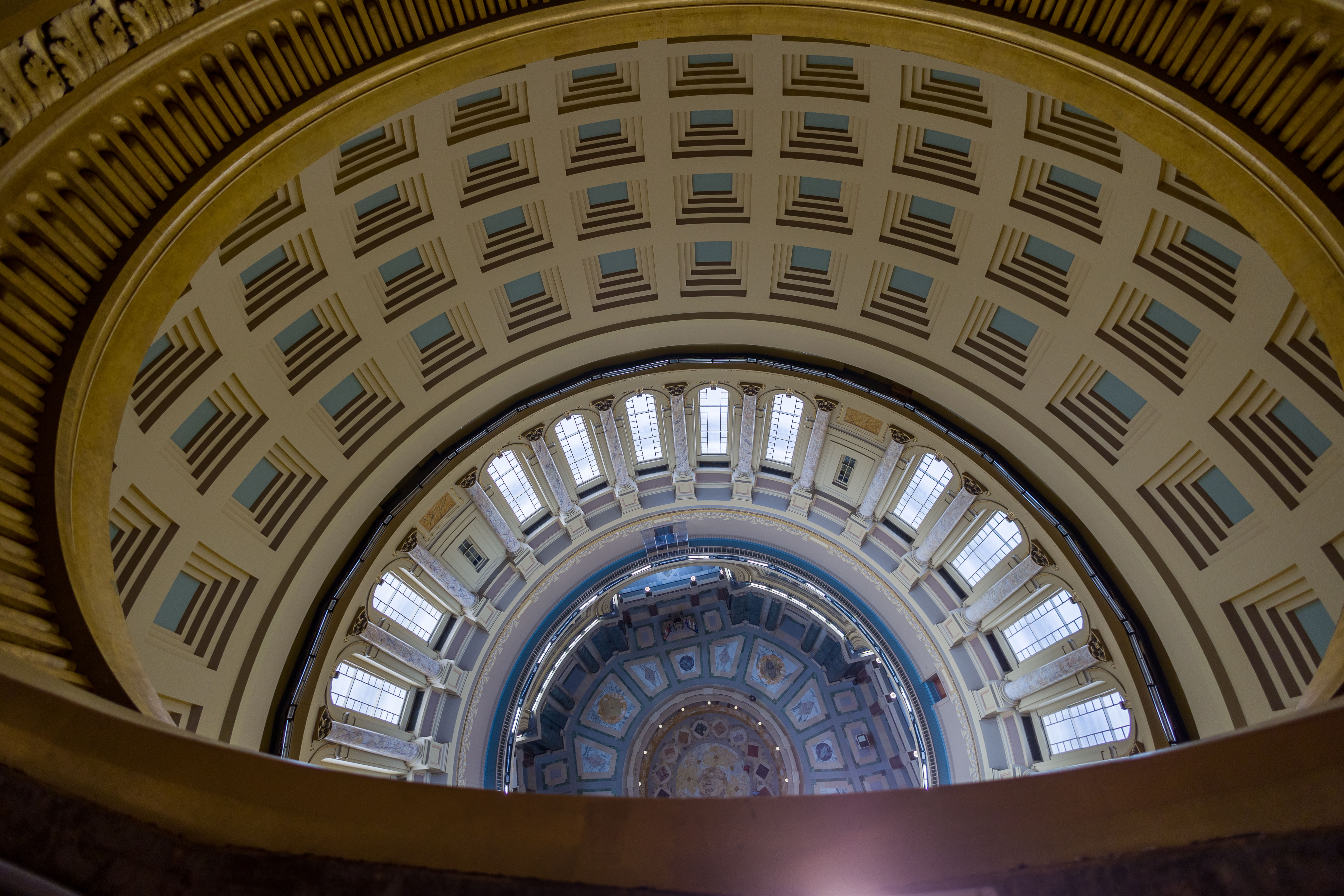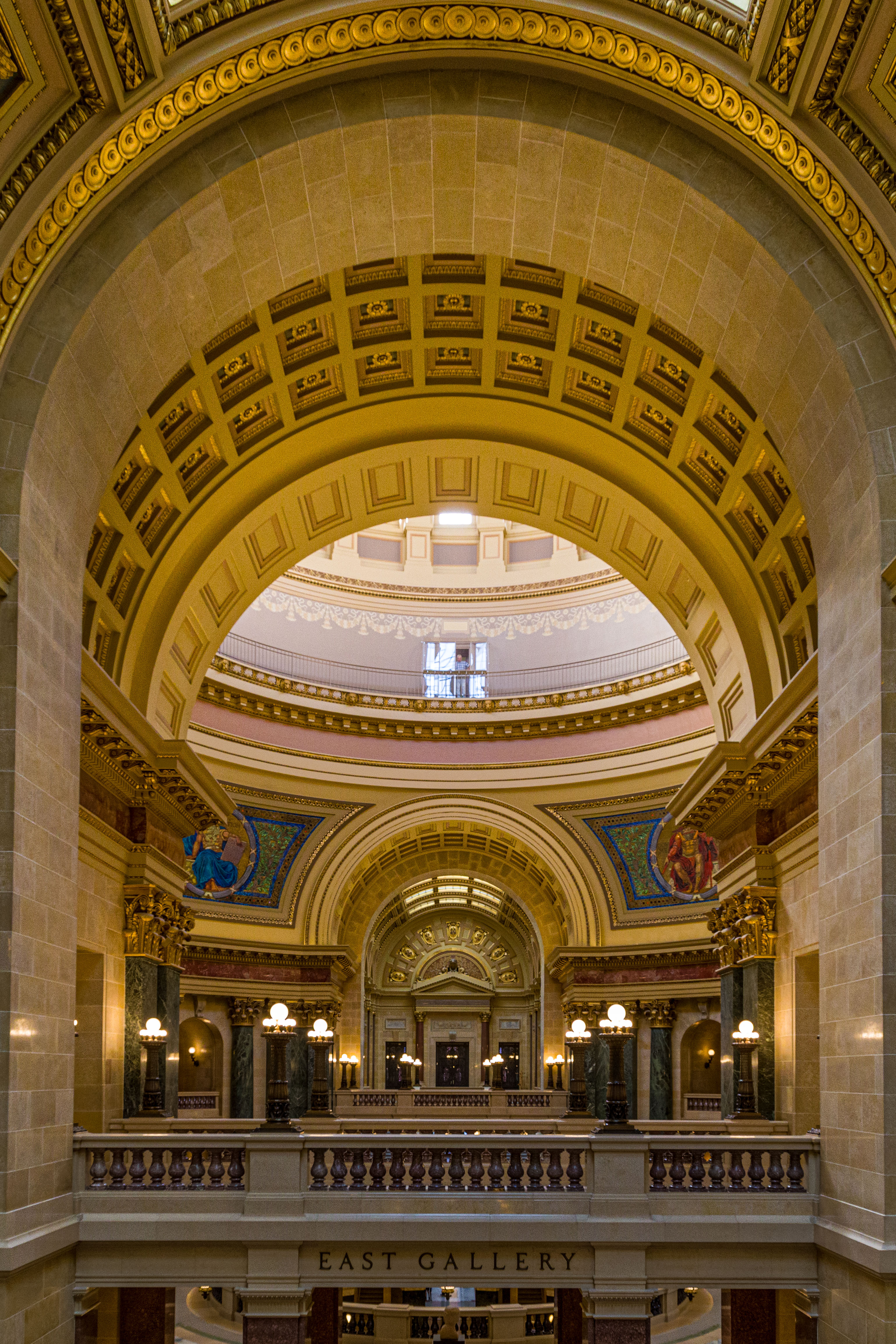 Photos from within the Capitol building, including a tour to the the very top levels (which closed to public tours in 1931). Includes panoramam from the top observation decks and view from inside the lantern at the very top around the inner dome mural and between the inner and outer domes (facades).