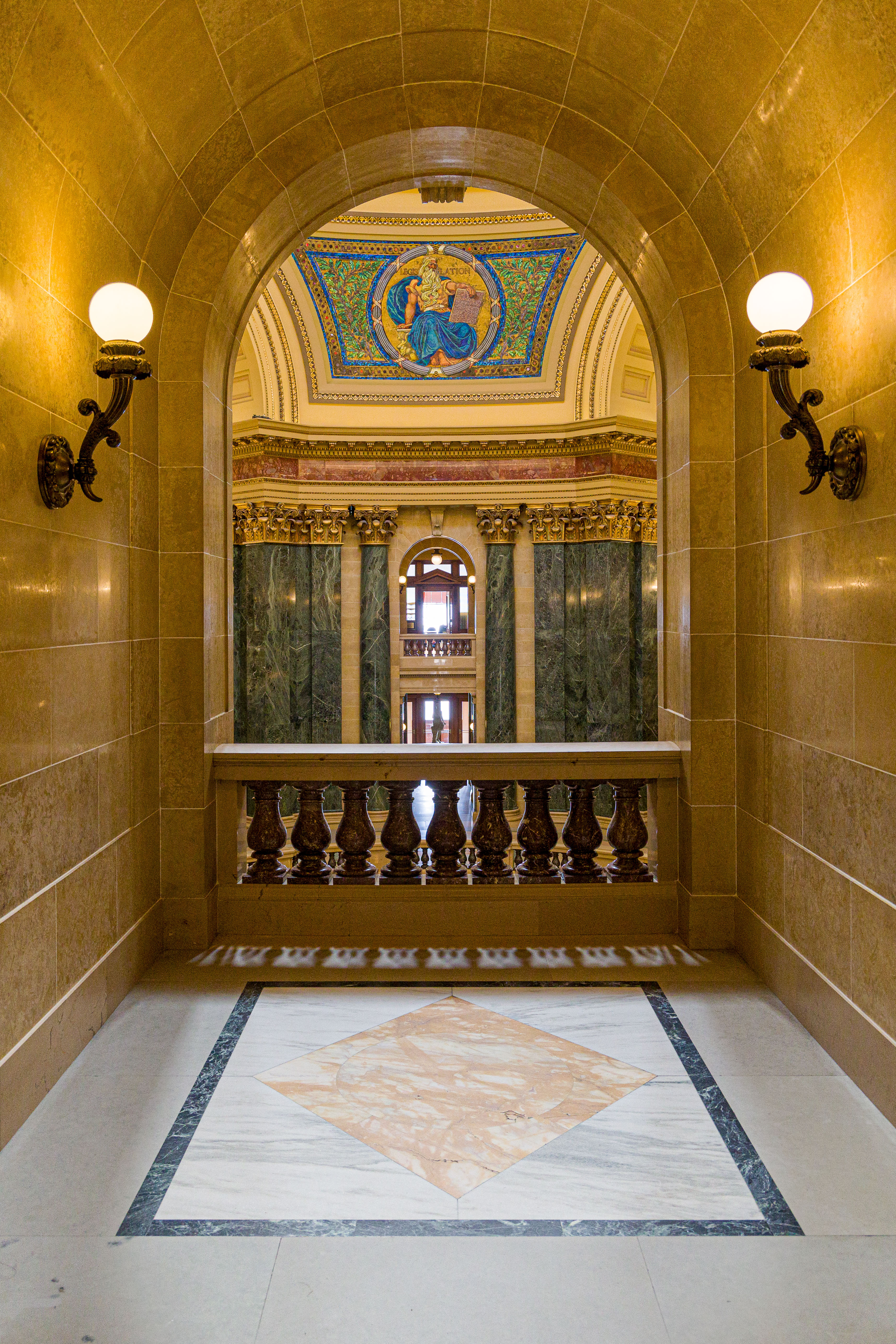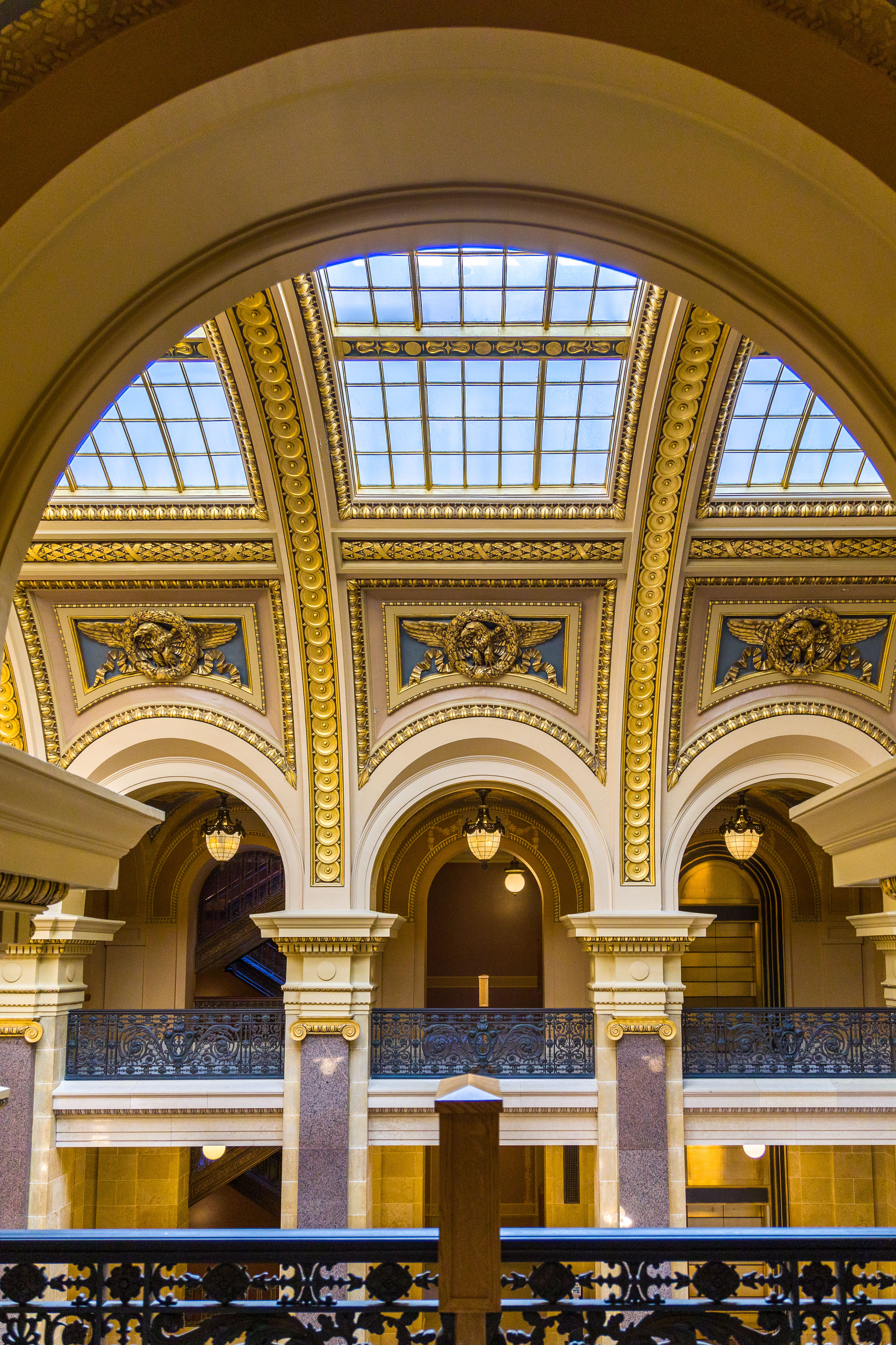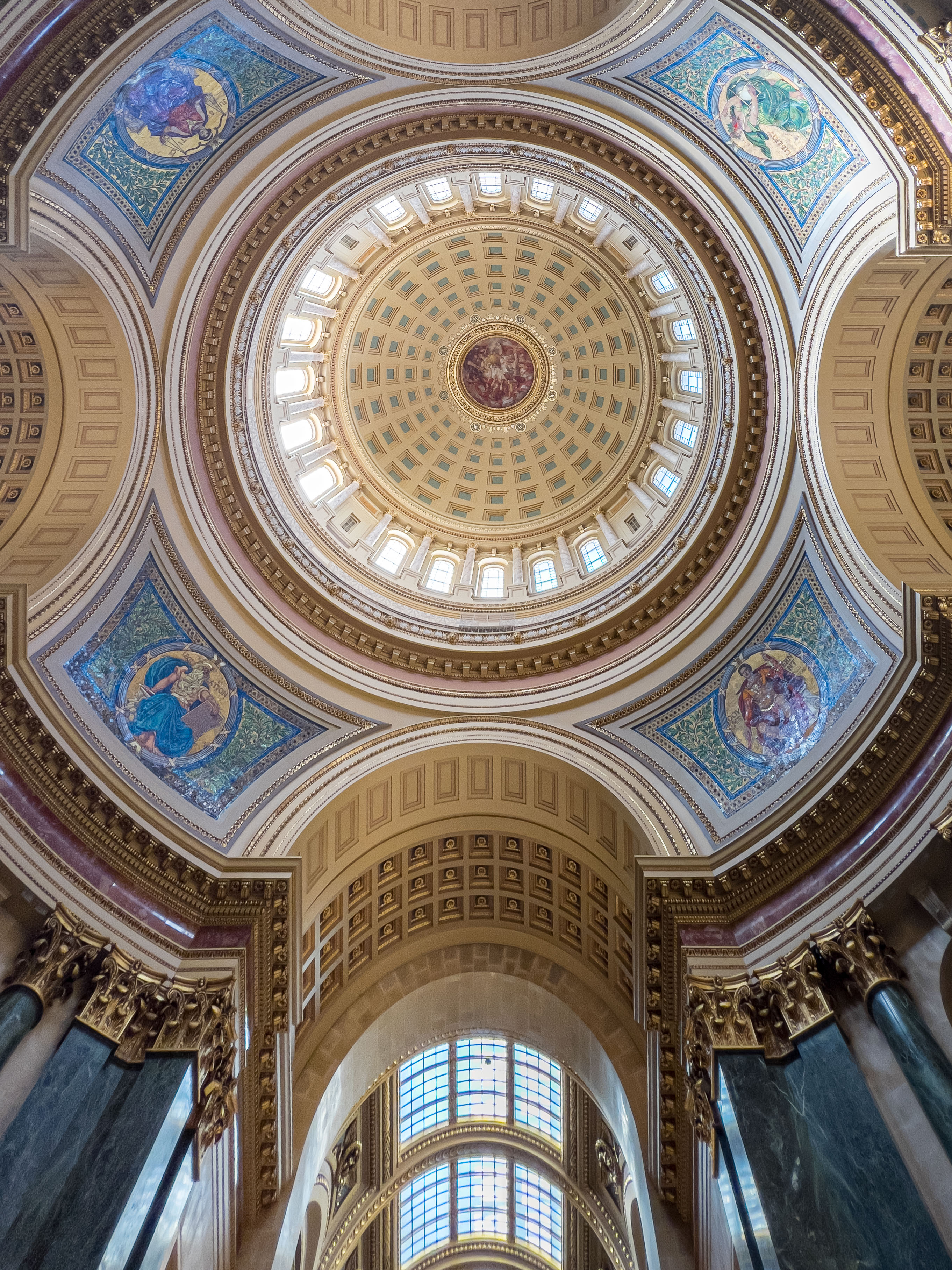 Photos from within the Capitol building, including a tour to the the very top levels (which closed to public tours in 1931). Includes panoramam from the top observation decks and view from inside the lantern at the very top around the inner dome mural and between the inner and outer domes (facades).